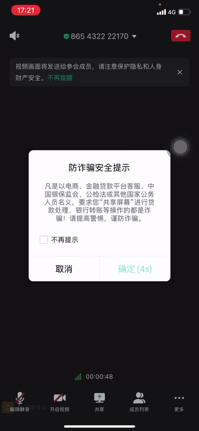 在用户使用亿联会议“屏幕共享“功能前,设置了防诈骗安全提示,提醒用户谨慎该功能,注意网络及软件使用安全。