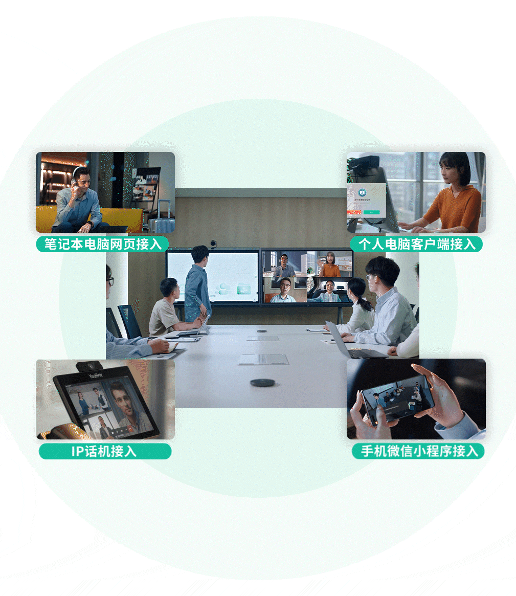 多端接入:亿联全能型的会议终端,只需简单部署,一键预约会议/点击加入已预约好的会议,即可开启4K高清音视频沟通。并可通过你的手机、个人电脑、话机多种设备接入会议。