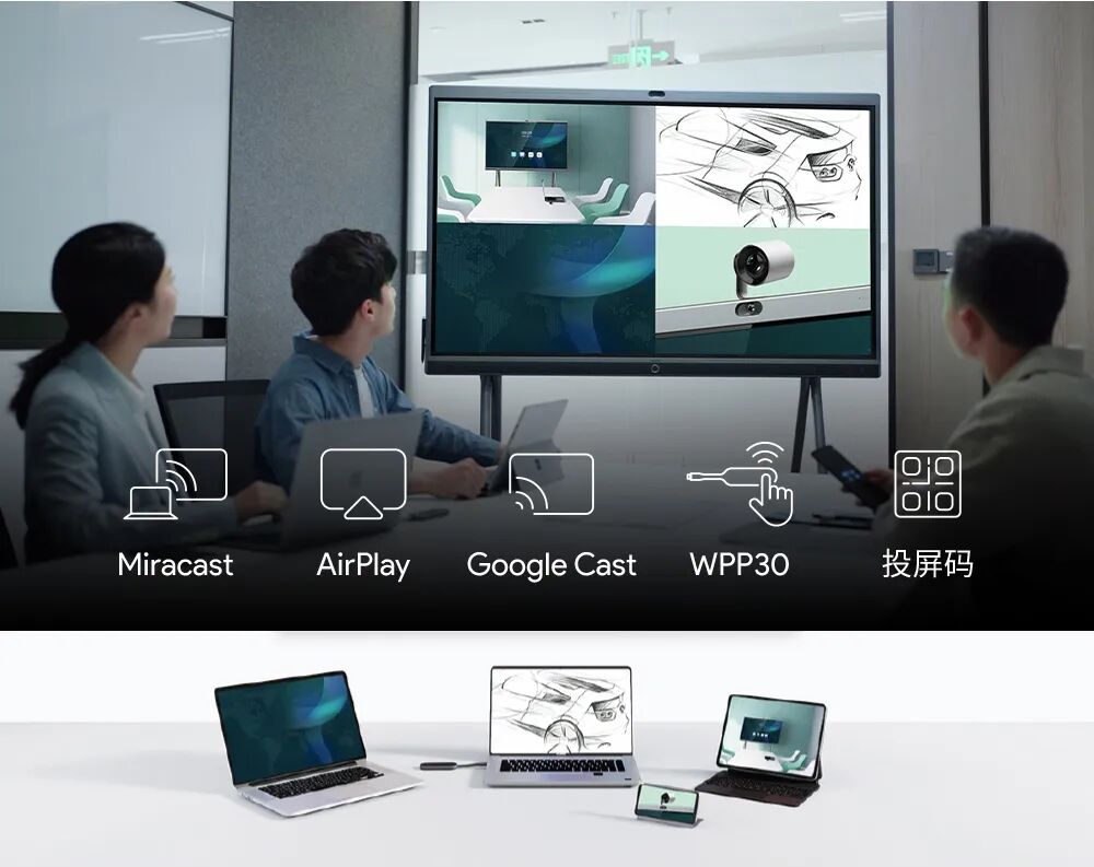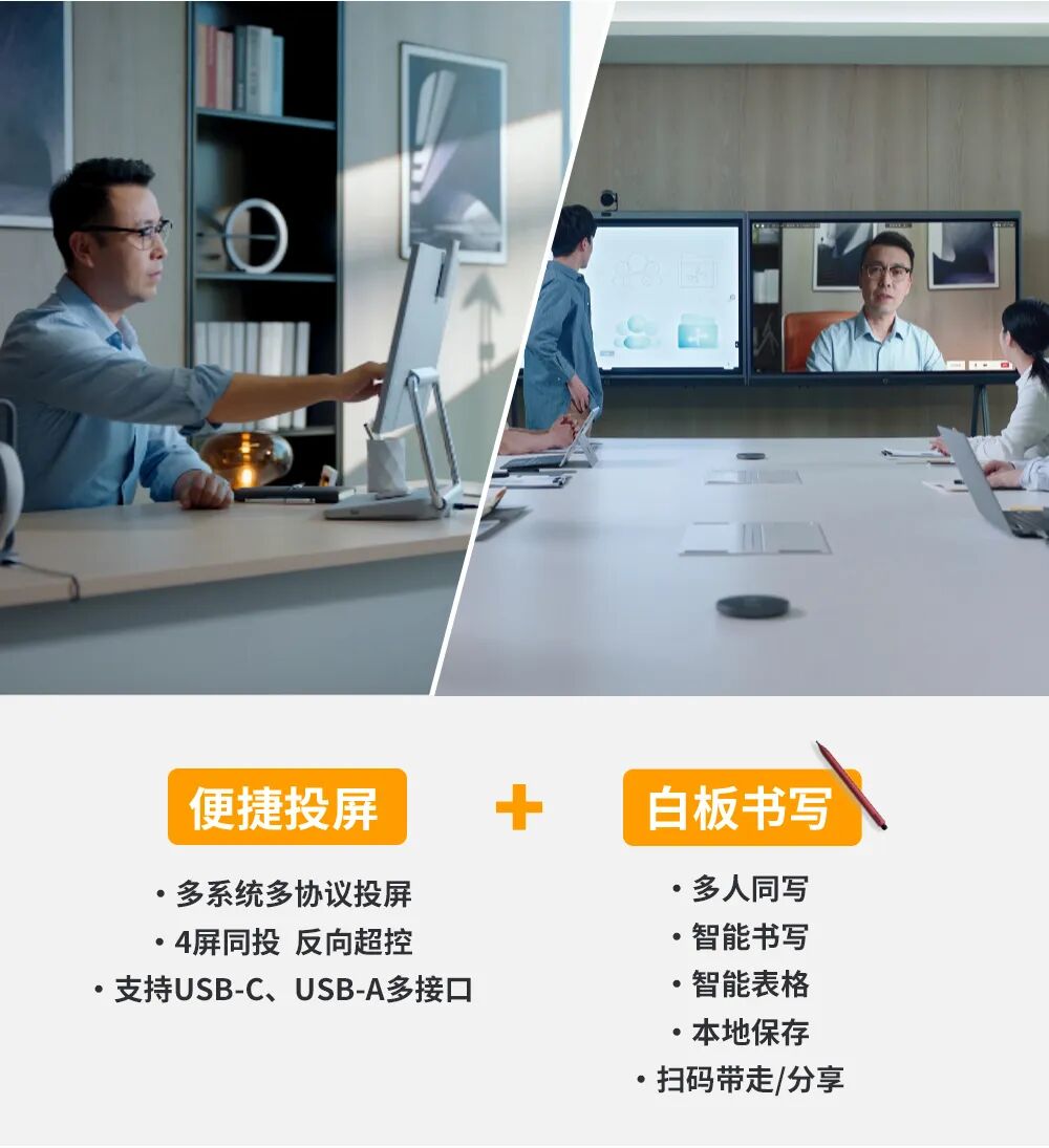 本地高效协作:多系统多协议投屏,四屏同投,辅流批注,无需频繁切换页面或设备,会议灵感不打断,会议决策更高效;