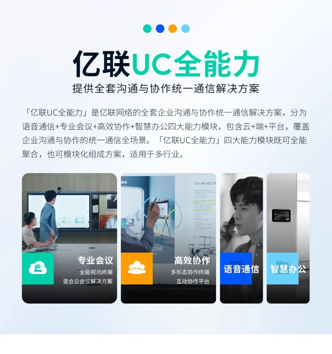 亿联专业会议+高效协作能力:提供全能视讯+协作终端,混合云会议解决方案,会议协作平台灵活组合的多种解决方案,让会议室成为最整洁、便利、高效、专业的会议空间: