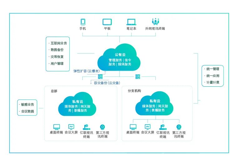 双云融合 安全可控:同时,当你与全球各地区部门或客户会议时,便可通过亿联混合云会议解决方案,它既有公有云的灵活,也有私有云的安全。亿联混合云会议解决方案灵活部署,可弹性扩容,节省带宽,同时保障会议数据本地化,提升会议沟通安全感。