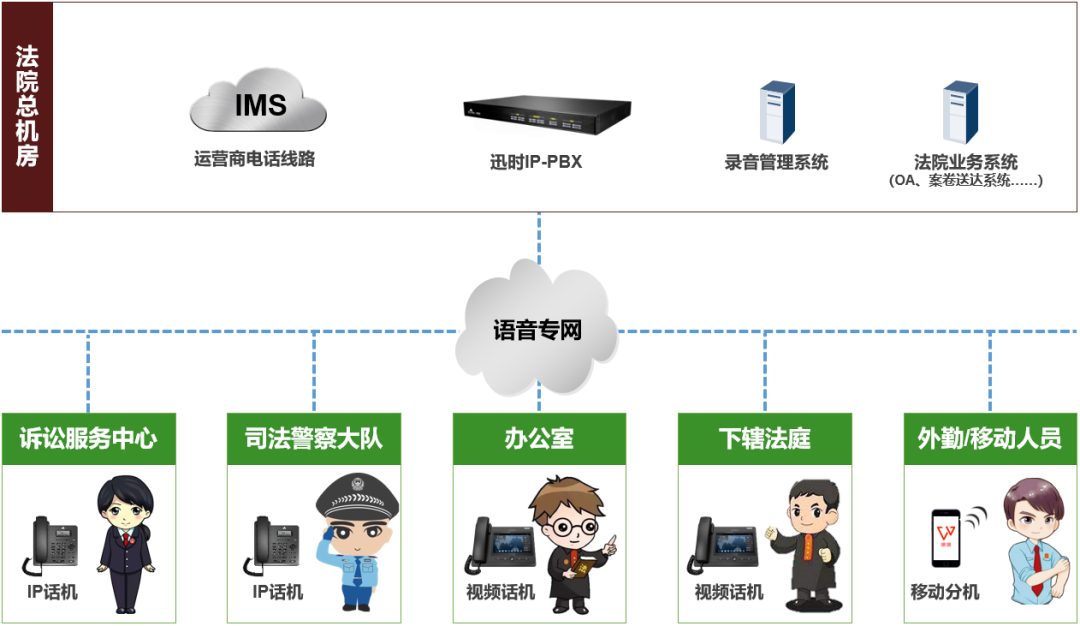 法院8个部门、4个下辖法庭、210个电话,统一注册到总机房的迅时OM500 IP-PBX,通过总院的IMS外线统一外呼。全部无需拉电话线,方便、简洁、高效,大大降低运维成本。