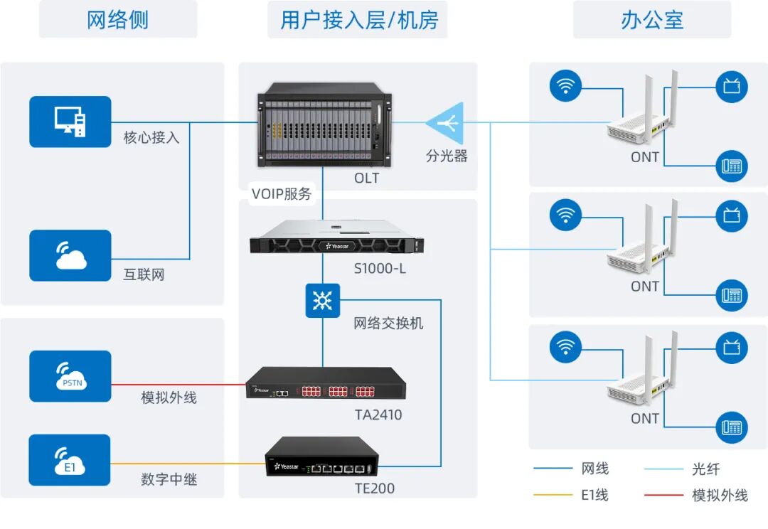 OLT接入运营商互联网,通过下联办公室ONT的PON口,由OLT下放互联网、电话业务。