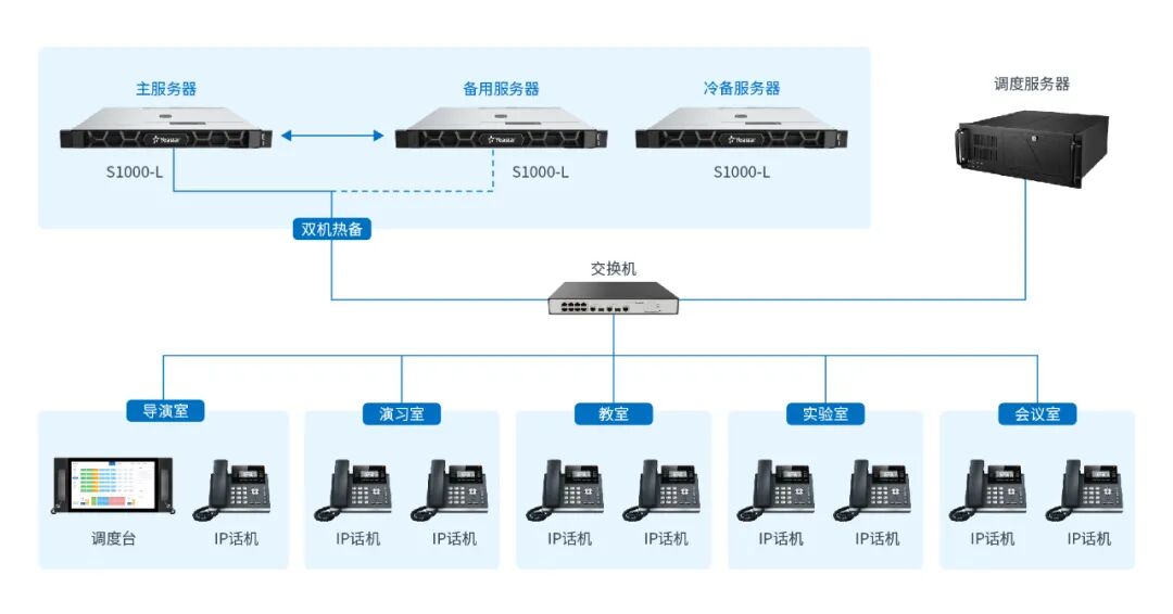导演室、演习室、教室、实验室、会议室分别部署IP话机,通过网络注册为S1000-L分机。