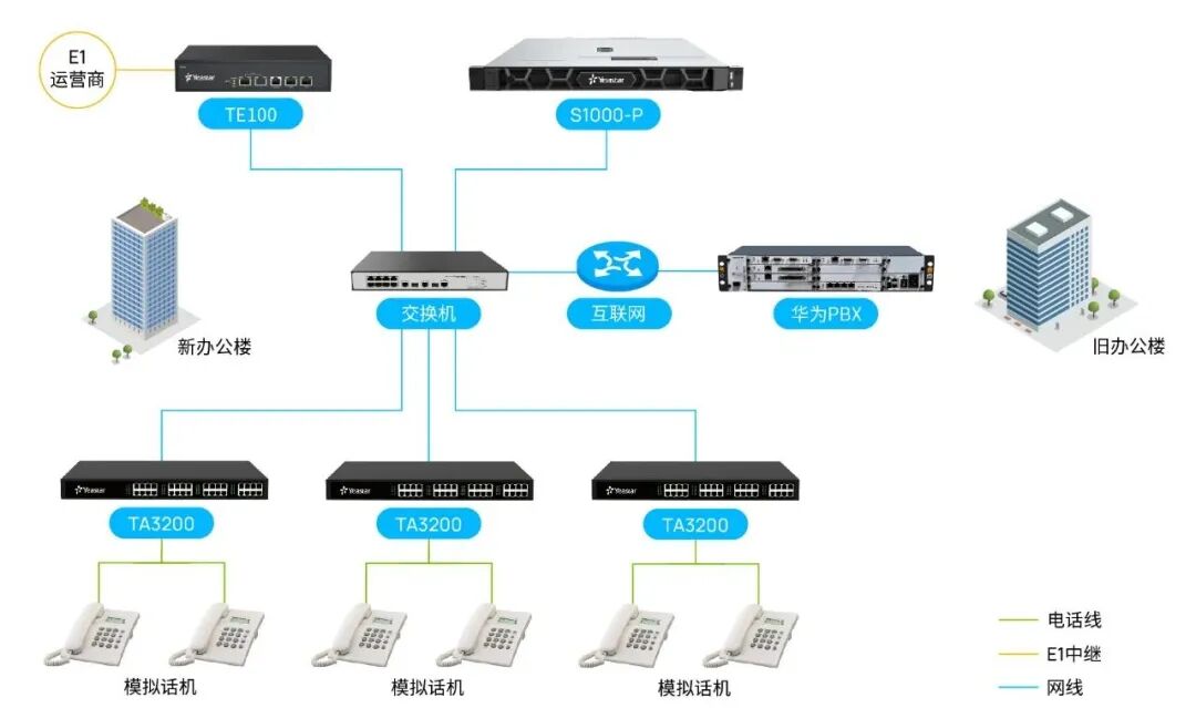 部署Yeastar内线口模拟语音网关(TA3200),通过网络注册至IPPBX,同时使用模拟线下联至各个工位上的模拟话机终端。