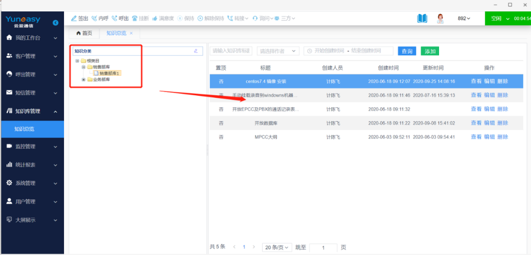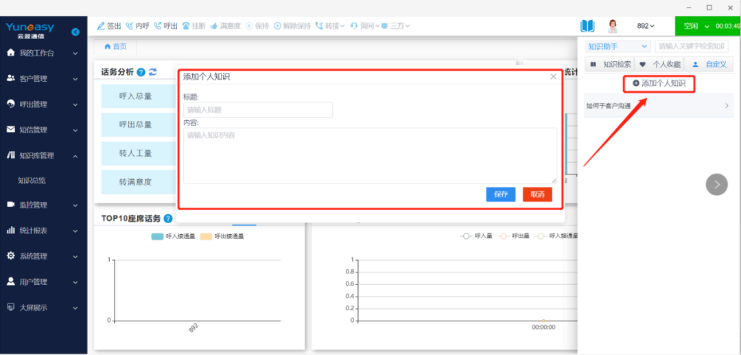 可以添加个人的知识库,添加文件、文字、图片等数据;根据座席代表所获取到的知识进行汇总;