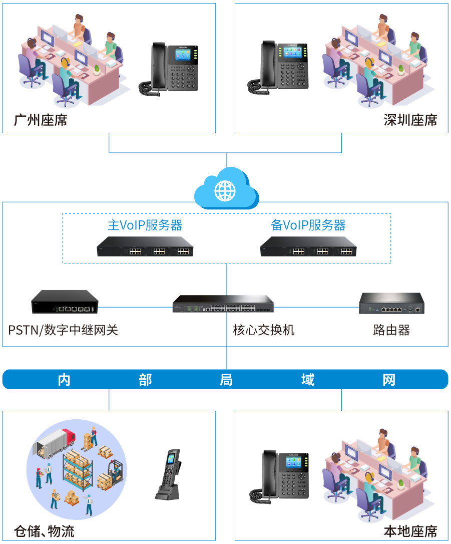 1、因电商服务平台、物流仓储中心在国内多地均有办公点,需要语音通讯系统能统一部署、集中管理;